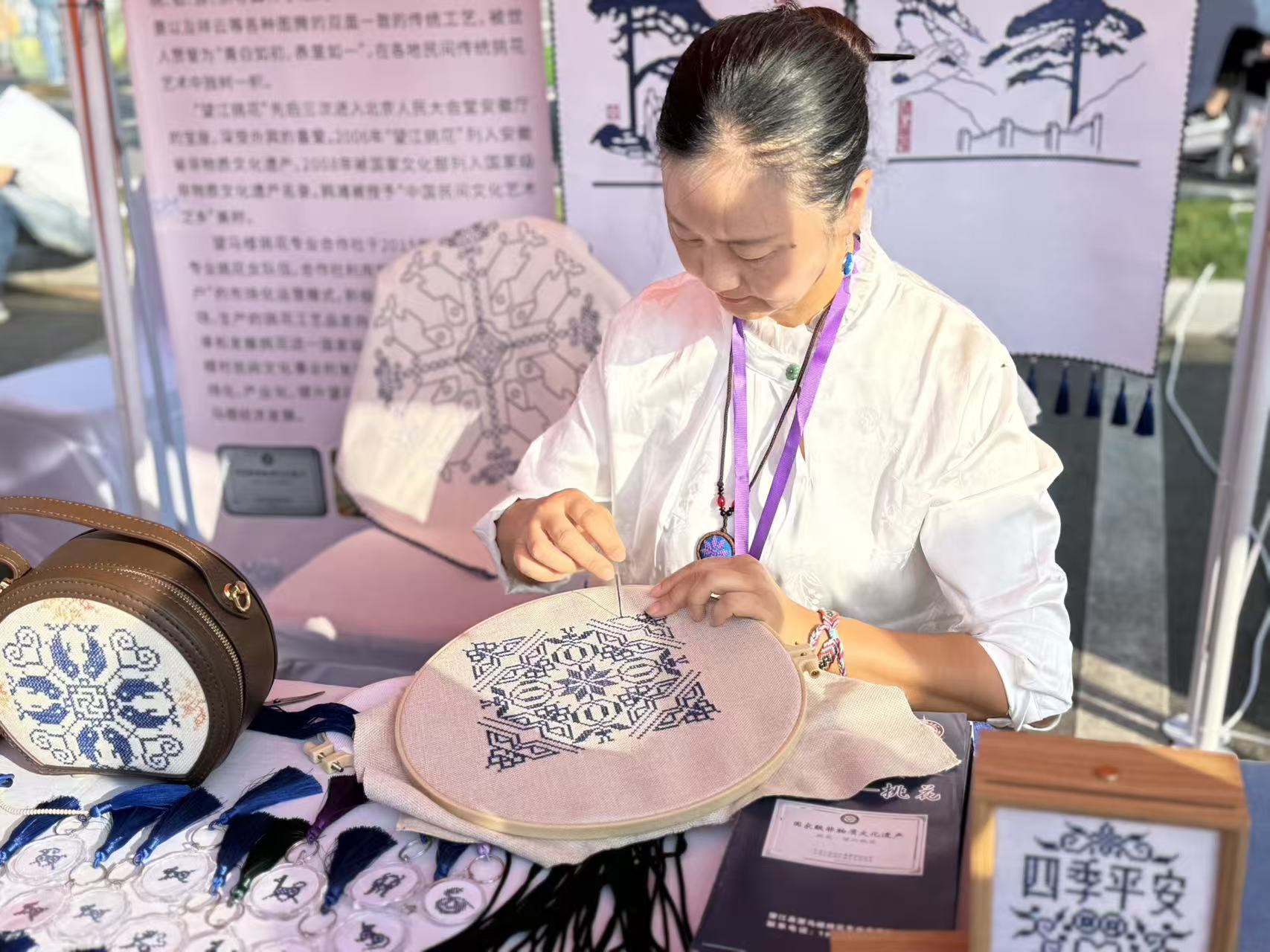 正在展区的静谧一角,“望江挑花”的展现吸引了不少人驻脚。一位挑花女工正凝思屏息,手中的银针正在棉布上下翻飞。她使用“挑、钻、逛、织”四种手法,以蓝线正在白布上逛走,斑纹轮廓便逐步清晰。最令人称奇的是,绣品正反两面如镜像般分歧。一位年轻不雅众低声念出展板上的引见:“青白如初,如一——说得实贴切。”这一刻,陈旧的身手取现代的赏识目光相遇。